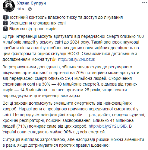 И.о. министра здравоохранения Ульяна Супрун в Facebook дала советы, как сохранить здоровье и избежать преждевременной смерти. Глава Минздрава рассказала, что нужно следить за давлением, уменьшить употребление соли и отказаться от транс-жиров.
