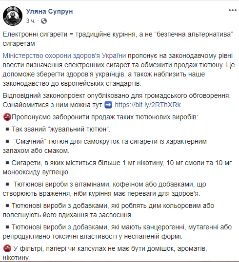 И.о. министра здравоохранения Ульяна Супрун предлагает на законодательном уровне ввести определение электронных сигарет и ограничить продажу табака. Об этом она сообщила в Facebook.