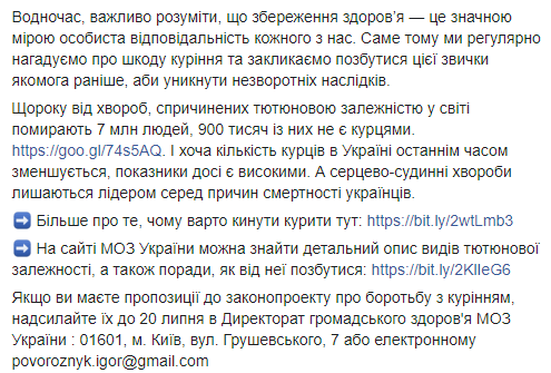 "Министерство здравоохранения Украины предлагает на законодательном уровне ввести определение электронных сигарет и ограничить продажу табака. Это поможет сохранить здоровье украинцев, а также приблизит наше законодательство к европейским стандартам", - отметила она.