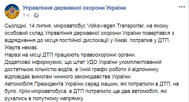 "Сегодня, 14 июля, микроавтобус Volkswagen Transporter, в котором личный состав Управления государственной охраны Украины возвращался из командировки к месту постоянной дислокации в Киеве, попал в ДТП. Жертв нет", - говорится в сообщении.