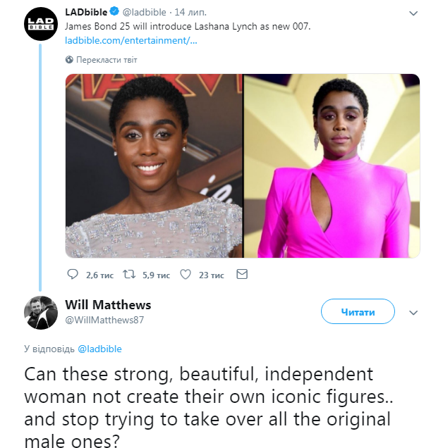 Фанаты "бондианы" негативно отреагировали на эту новость в социальной сети. Об этом передает ЛентаРу. Пользователи Twitter предлагают сильным и красивым женщинам "создавать свои собственные иконы и перестать пытаться переделать под себя оригинальных мужских персонажей".
