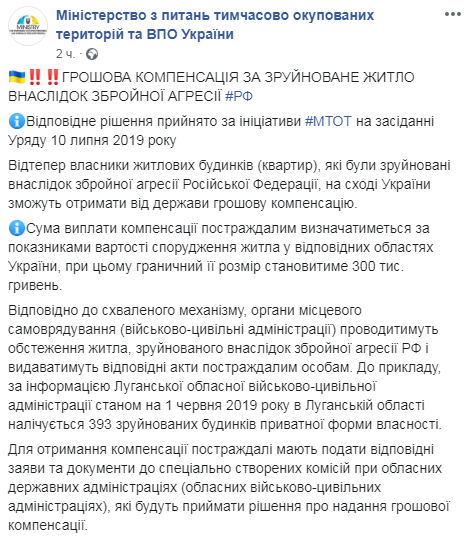 В Кабмине на заседании 10 июля приняли решение компенсировать до 300 тысяч гривен за разрушенное в ходе боевых действий жилье на Донбассе.