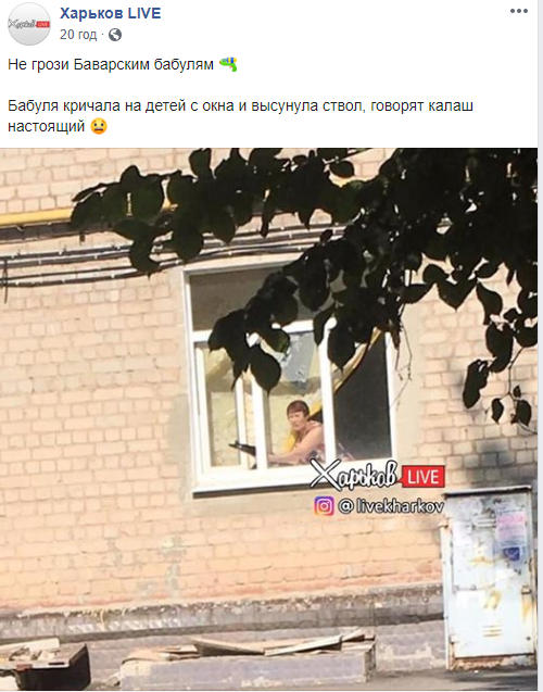 "Не грози Баварским бабулям. Она кричала на детей из окна и высунула ствол, говорят, что автомат Калашникова настоящий", - подписали фотографию пенсионерки свидетели происшествия.