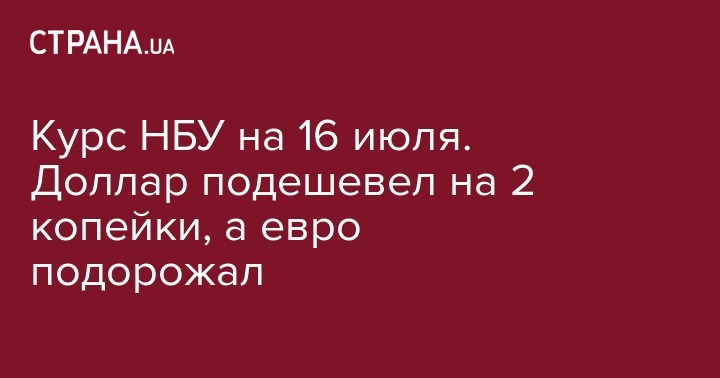 Во вторник, 16 июля, Национальный банк Украины установил новый курс для основных валют по отношению к гривне. По сравнению с предыдущим банковским днем доллар подешевел на 2 копейки. Об этом свидетельствуют данные на сайте регулятора.
