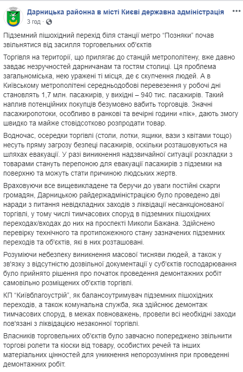 Подземный пешеходный переход у станции метро "Позняки" начал освобождаться от засилья торговых объектов. Об этом сообщает Дарницкая районная администрация в Facebооk. По утверждению администрации  на стихийную торговлю постоянно жаловались.
