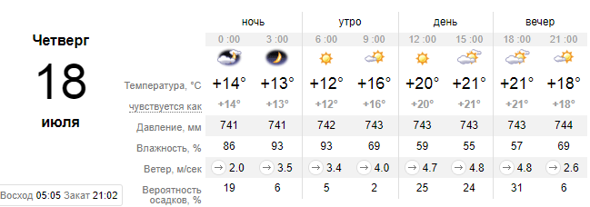 18 июля солнце в Киеве взойдет в 05:05. Закат - в 21:02. Долгота дня - 15:55. За последние 130 лет наблюдений максимальная температура 18 июля достигала +34,4 в 2007 году. Минимальная была зафиксирована в 1989 году и составила +9,4.