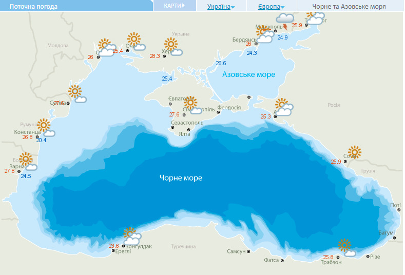 На курортах Азовского моря температура воды достигнет +24...+26; температура воды в Черном море около +26...+28.