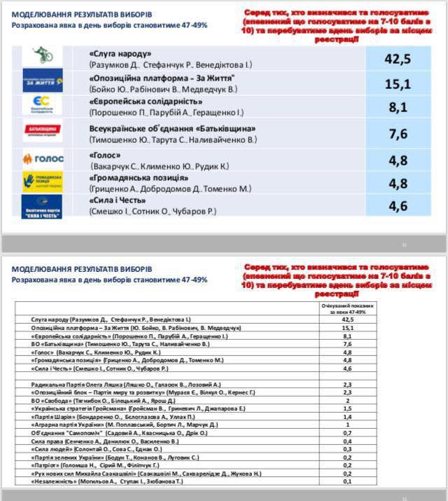 Рост шел, судя по всему, за счет партии "Слуга народа", которая, наоборот, показывала падение. И по той же причине – отсутствие реальных шагов навстречу мирному урегулированию и повторение риторики Порошенко в адрес России.