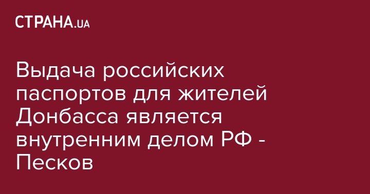 Выдача паспортов РФ жителям Луганской и Донецкой областей Украины является внутренним делом России, также как и предоставление украинских удостоверений личности является внутренним делом Украины. Об этом заявил журналистам пресс-секретарь президента РФ Дмитрий Песков, пишет Интерфакс.