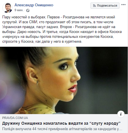 "Пару новостей о выборах. Первое - Ризатдинова не является моей супругой. И все СМИ, кто продолжает об этом писать, пасут задних. Второе - Ризатдинова не идёт на выборы. Дарю новость. И третье, когда Косюк находит в офисе Косюка "чернуху" на выборы против потенциальных конкурентов Косюка, спросите у Косюка, как дела у него в курятнике", - написал Александр Онищенко.