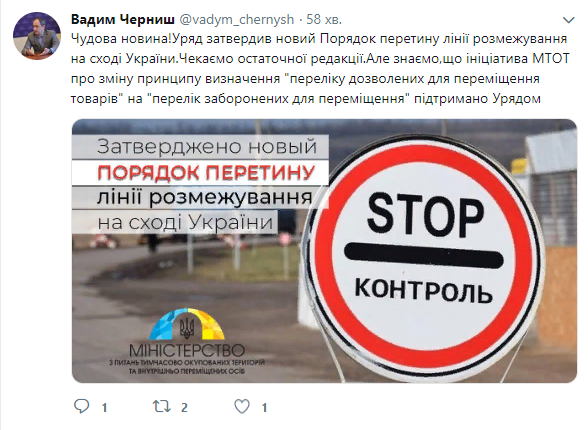 "Отличная новость! Правительство утвердило новый Порядок пересечения линии разграничения на востоке Украины. Ждем окончательной редакции. Но знаем, что инициатива МинВОТ об изменении принципа определения "перечня разрешенных для перемещения товаров" на "перечень запрещенных для перемещения" поддержана правительством", - написал Черныш.