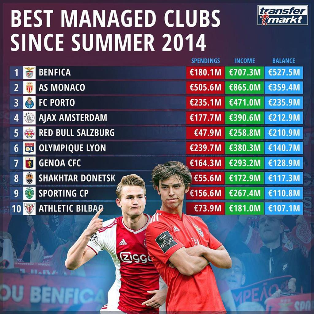 Возглавляет рейтинг португальская "Бенфика" с балансом +527,5 млн евро. Также в тройку лидеров вошли французский "Монако" (+359,4 млн евро) и португальский "Порту" (+235,9 млн евро).