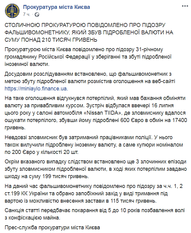 Досудебное расследование установило, что фальшивомонетчик разместил объявление на сайте https://miniaylo.finance.ua/, чтобы продавать свою "продукцию". На объявление откликнулся мужчина, пожелавший обменять валюту по привлекательному курсу.