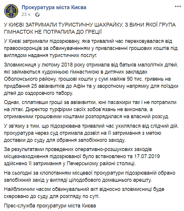 Еще в феврале 2018 злоумышленница получила от родителей детей, занимающихся художественной гимнастикой в секциях Оболонского района, почти 90 тыс. гривен. На эти средства она должна была купить 25 авиабилетов в Афины и обратно: в Грецию дети летели, чтобы оздоровиться в лагере.