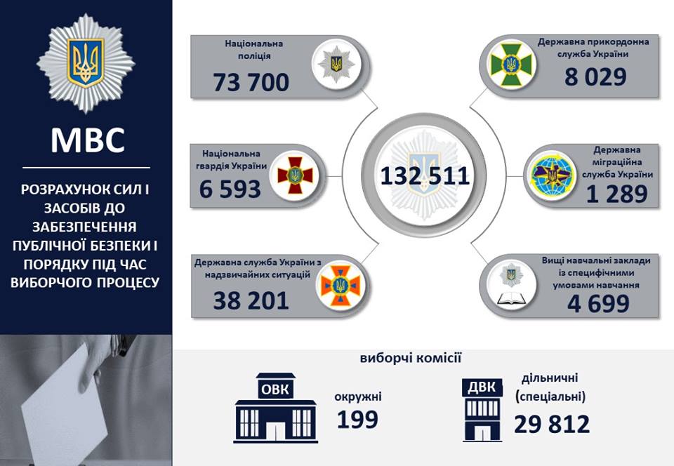 "В день голосования будет задействовано дополнительно 132 500 сотрудников МВД (Нацполиции, Нацгвардии, пограничной, миграционной, спасательной служб), включая оперативное дежурство групп быстрого реагирования, спецназ и – впервые (!) - систему авиационной безопасности МВД", - написал министр.