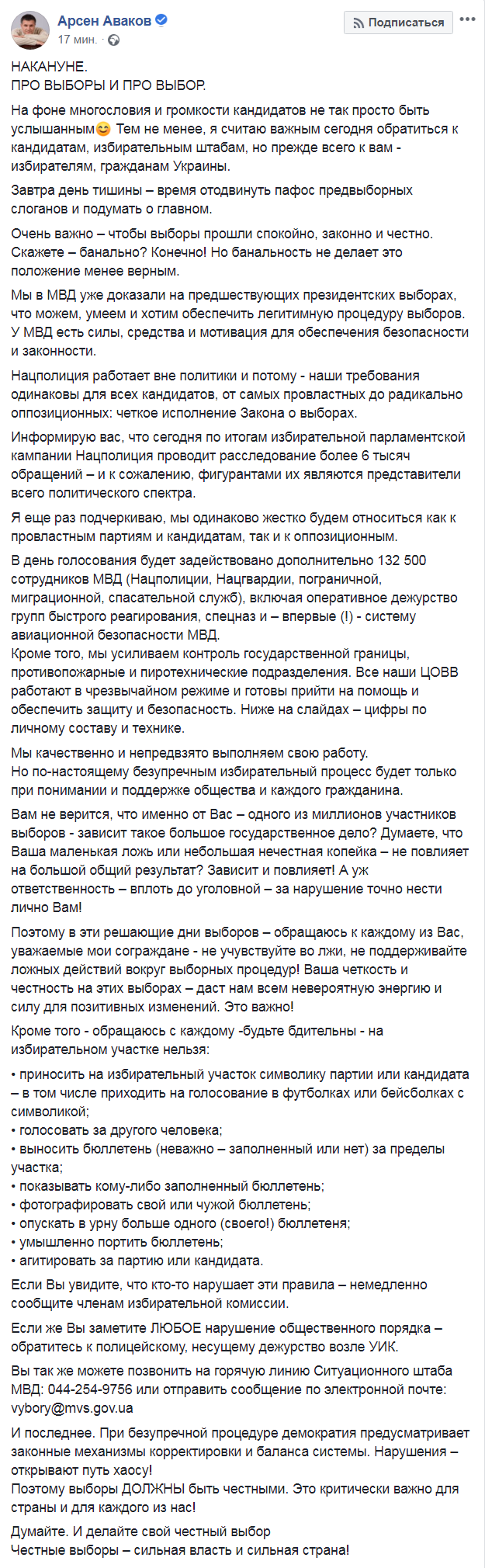 Министр внутренних дел Украины Арсен Аваков призвал всех участников избирательного процесса соблюдать 21 июля закон, рассказал, как полиция будет обеспечивать порядок на участках и напомнил, как надо правильно голосовать. Соответствующий пост он разместил у себя на Facebook.