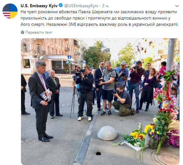 "На третью годовщину убийства Павла Шеремета мы призываем власти проявить приверженность к свободе прессы и привлечь к ответственности виновных в его смерти. Независимые СМИ играют важную роль в развитии украинской демократии", - сказано в сообщении посольства.