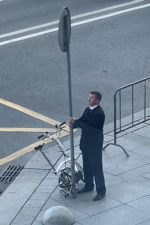 Опубликованы фотографии, на которых охрана пытается отогнать велосипед, пристегнутый тросом к дорожному знаку. После неудавшихся попыток сломать трос или расшатать знак, чтобы вытащить его, охранники позвали рабочего с ломом. После этого велосипед удалось высвободить, и его увезли в сторону входа в здание.