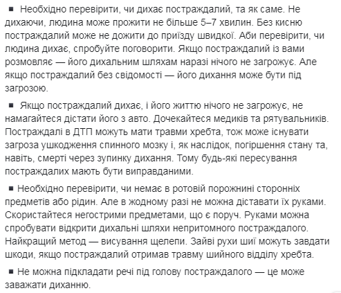 ▪️ Если дыхательные пути открыты, необходимо убедиться, поднимается ли грудная клетка пострадавшего. Дыхание можно попробовать услышать - для этого поднесите ухо ко рту пострадавшего. Если пострадавший дышит, продолжайте наблюдать за его состоянием и другими возможными повреждениями, которые вам видны. Если же дыхание отсутствует - начинайте сердечно-легочную реанимацию. Для этого понадобится клапан-маска с автомобильной аптечки. (Возможно и искусственное дыхание, если средств для легочной реанимации у вас нет).