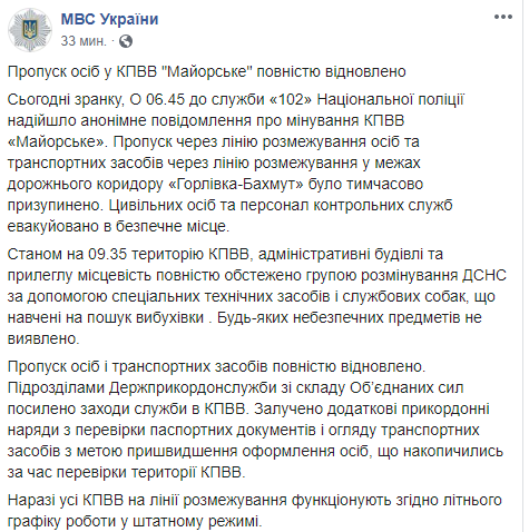 "По состоянию на 09:35 территорию КПВВ, административные здания и прилегающую территорию полностью обследовали… каких-либо опасных предметов не выявлено. Пропуск лиц и транспортных средств полностью возобновлен", - сказано в сообщении.
