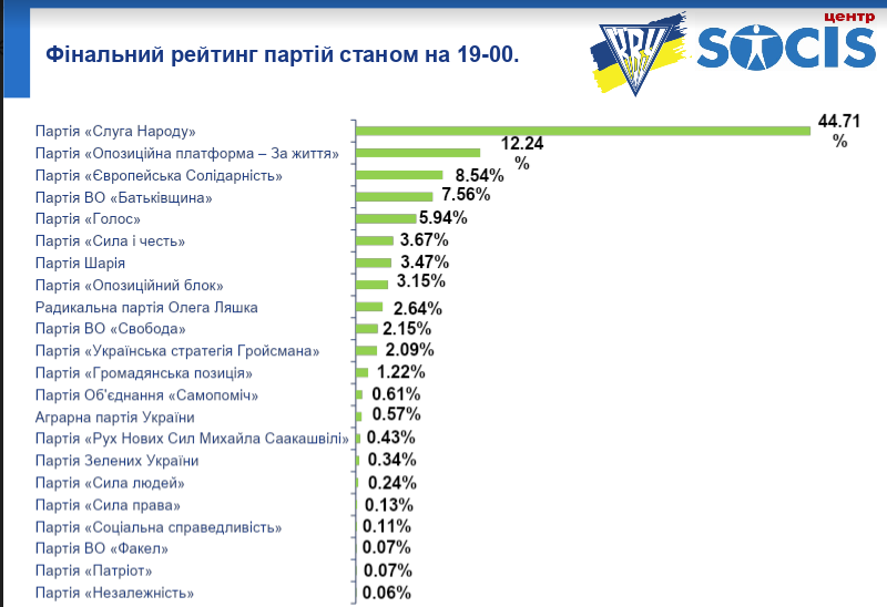После этого были обнародованы результаты нескольких экзитполов, которые позволяют до объявления результатов ЦИК увидеть более-менее достоверную картину итогов выборов и понять, какие партии прошли в новый парламент.