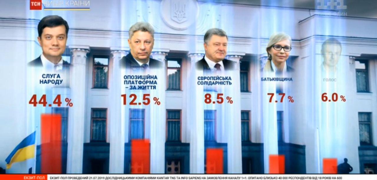 В 20:00 в прямом эфире результаты собственного экзитпола озвучили в программе ТСН на телеканале "1+1". Его провели компании Kantar TNS и Info Sapiens.