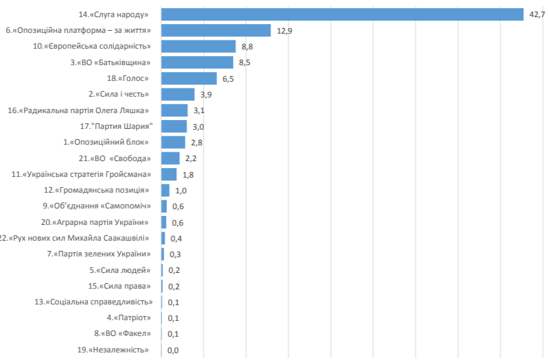 Не преодолевают проходной барьер в 5% и, соответственно, не проходят в парламент нового созыва по спискам партии "Сила и честь" – 3,67%, "Партия Шария" – 3,47%, "Оппозиционный блок" – 3,15%, Радикальная партия – 2,66%, "Свобода" – 2,15%, "Украинская стратегия" Гройсмана – 2,09% и "Гражданская позиция" – 1,22%.
