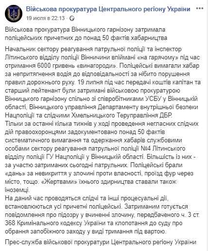 По данным пресс-службы, только за последние несколько недель во время проведения негласных следственных действий правоохранителями задокументировано более 50 фактов систематического вымогательства и получения взяток должностными лицами сектора реагирования патрульной полиции №4 Литинского отдела полиции ГУ Нацполиции в Винницкой области. Большая часть из них - с участием задержанных сегодня патрульных.