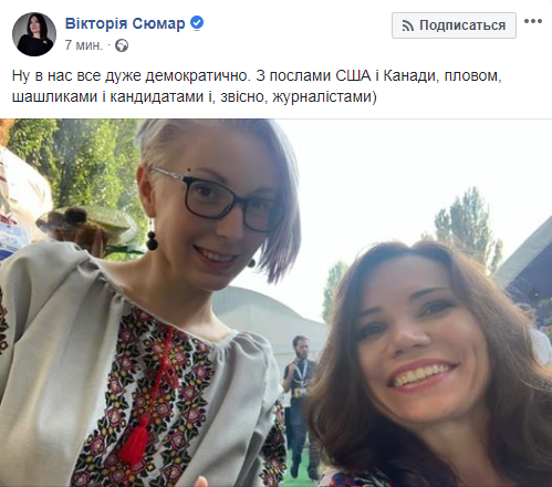 "У нас все очень демократично. С послами США и Канады, пловом, шашлыками и кандидатами и, конечно, журналистами", - написала Сюмар и выложила несколько снимков с фуршета, который проходит на свежем воздухе.