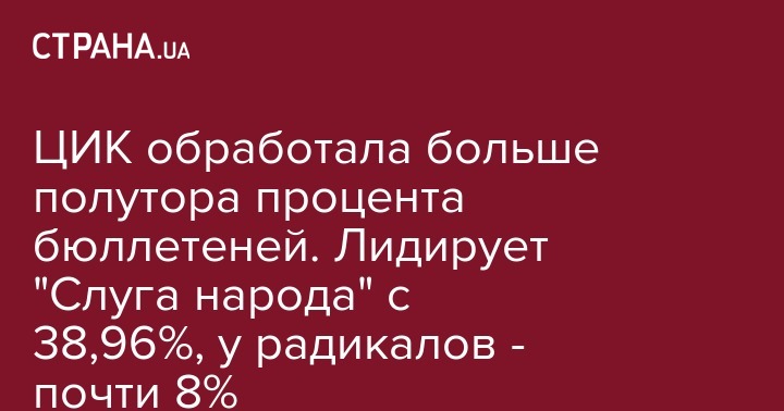 ЦИК обработала больше полутора процента бюллетеней. Лидирует "Слуга народа" с 38,96%, у радикалов - почти 8%