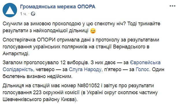 Из 12 украинских полярников на станции "Академик Вернадский" в Антарктиде за "Голос" проголосовали пять человек. Такие данные приводит в Facebook Гражданская сеть "Опора".