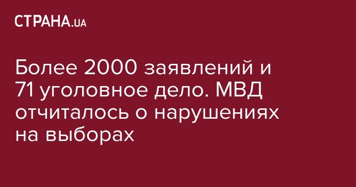 "С начала внеочередных выборов народных депутатов... было зарегистрировано заявлений и сообщений 2 105, начато 71 уголовное производство и составлено 66 админпротоколов", - сказал Яровой. При этом замминистра отметил, что пострадавших на участках не было.