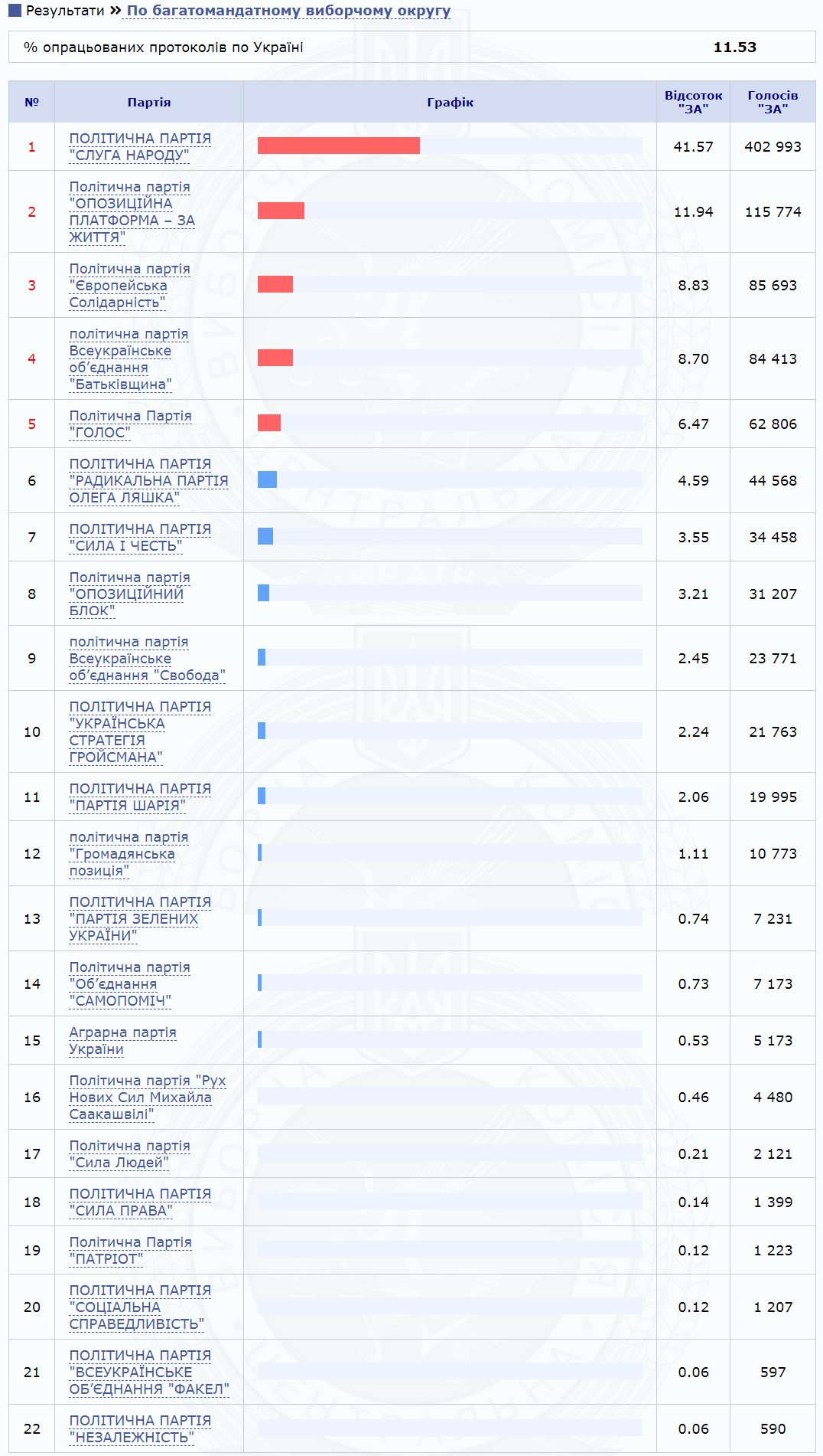 Центральная избирательная комиссия обработала 11,53% бюллетеней. По сравнению с предыдущими промежуточными результатами количество партий, преодолевающих проходной барьер. уменьшилось на одну.. Данные по результатам обработки обнародованы на сайте ЦИК.
