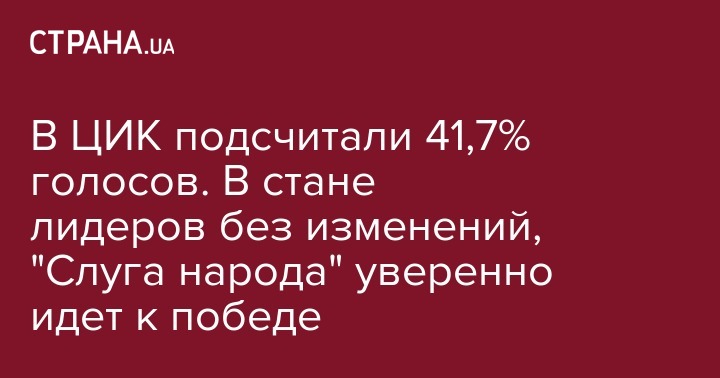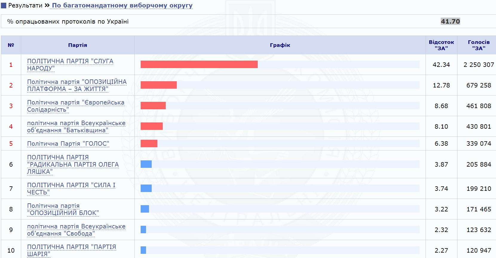Сегодня, 22 июля, ЦИК продолжает подсчитывать бюллетени по итогам голосования на досрочных выборах в Раду. По состоянию на 09.10, в ЦИК обработали уже 41,70% протоколов из ОИК. Лидеры все те же. В Верховную Раду проходят такие партии - "Слуга народа" (42,34% голосов избирателей), "Оппозиционная платформа - За жизнь" (ОПЗЖ) - 12,78%, "Европейская солидарность" - 8,68%, "Батькивщина" - 8,10%, "Голос" - 6,38%.