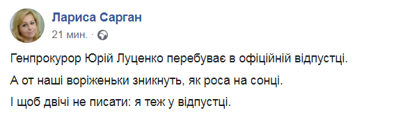 Сарган заявила, что Луценко находится в официальном отпуске. "Генпрокурор Юрий Луценко находится в официальном отпуске", - написала секретарь назло врагам.