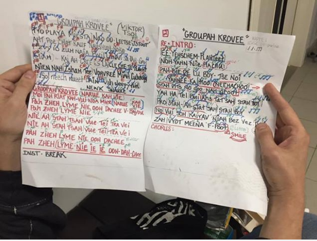 На ней русский текст песни записали латинским буквами, чтобы музыканты могли его прочитать. Он разбит на слоги и сопровождается пометками о том, как нужно исполнять композицию.