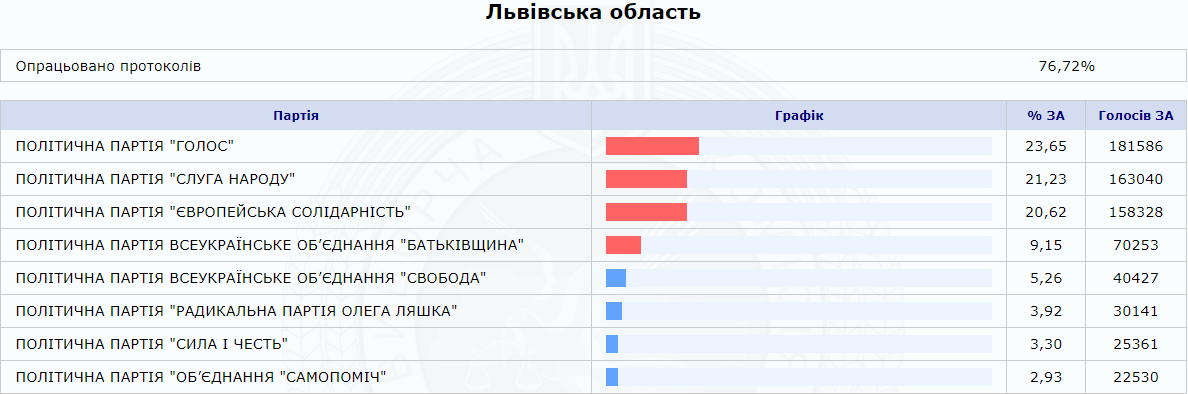 Стоит отметить, что Львовская область стала единственным регионом, где партия "Голос" заняла первое место с существенными процентами.