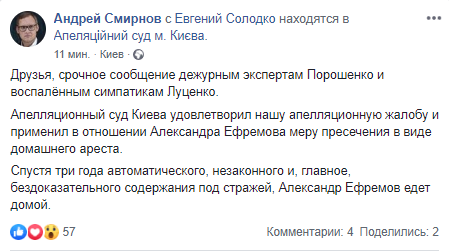 "Друзья, срочное сообщение дежурным экспертам Порошенко и воспалённым симпатикам Луценко. Апелляционный суд Киева удовлетворил нашу апелляционную жалобу и применил в отношении Александра Ефремова меру пресечения в виде домашнего ареста. Спустя три года автоматического, незаконного и, главное, бездоказательного содержания под стражей, Александр Ефремов едет домой", - написал он.
