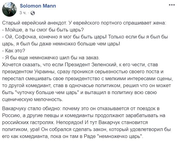 Вакарчуку стало обидно: почему это он отказывается от поездок в Россию, а другие певцы и комедианты продолжают зарабатывать на российских гастролях. Непорядок! И тут Вакарчук становится политиком, ура! Он собрался сделать закон, который удовлетворил бы его как комедианта, пока он там в Раде "немножечко царь", – пишет израильский журналист Соломон Манн, комментирующий события в Украине.
