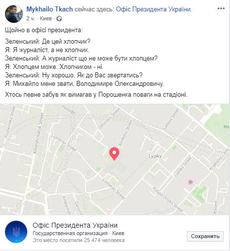 Глава Украины Владимир Зеленский назвал журналиста программы "Схемы" Михаила Ткача "мальчиком" в Офисе президента. Об этом сам Ткача заявил на своей странице в соцсети Facebook.
