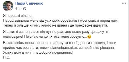 По словам Савченко, которая набрала всего 8 голосов поддержки, говорит, что в жизни "освобождалась от пут не раз", но на этот раз "это ощущение невероятное". К своему посту она добавила фото горящей агитки за себя саму.