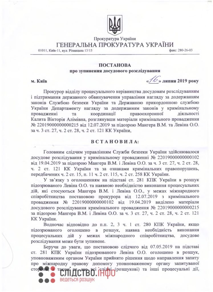 Как свидетельствует документ, ГПУ остановила следствие по главным фигурантам дела Гандзюк еще 16 июля. Генпрокуратура объединила подозреваемых в одно производство и остановила его потому, что Алексей Левин находится в розыске. Дескать, с ним пока нет возможности проводить следственные действия в Украине.