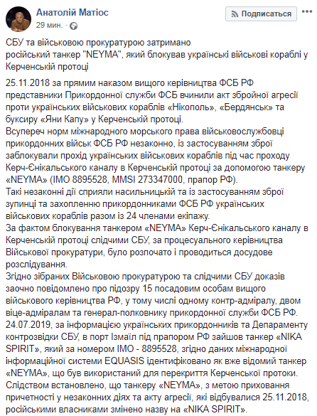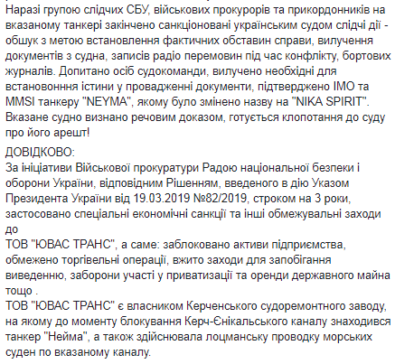 "По факту блокирования танкером "NEYMA" Керчь-Еникальского канала в Керченском проливе следователями СБУ, под процессуальным руководством Военной прокуратуры, было начато и проводится досудебное расследование… 24 июля по информации украинских пограничников в порт Измаил под флагом РФ зашел танкер "NIKA SPIRIT", который по номеру ИМО - 8895528, по данным международной информационной системы EQUASIS идентифицирован как уже известный танкер "NEYMA", который был использован для перекрытия Керченского пролива", - сказано в сообщении.