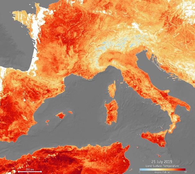 Ученые из Европейского космического агентства опубликовали снимок аномальной жары на территории Европы, которая была зафиксирована 25 июля. Температура в Бельгии, Нидерландах и Германии достигла 39-40 градусов Цельсия, и приблизилась к историческому максимуму в 41 градус, который был зафиксирован в 1947 году.