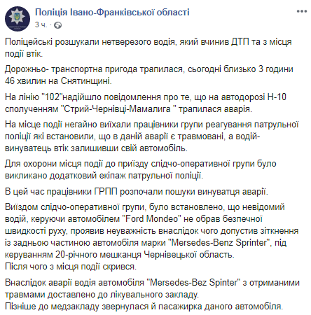 Инцидент произошел около 03:15 поблизости села Заболотово. По данным полиции, управляя автомобилем "Ford Mondeo", водитель не выбрал безопасную скорость движения, проявил невнимательность в результате чего допустил столкновение с задней частью автомобиля марки "Mersedes-Benz Sprinter"  под управлением 20-летнего жителя Черновицкой области.