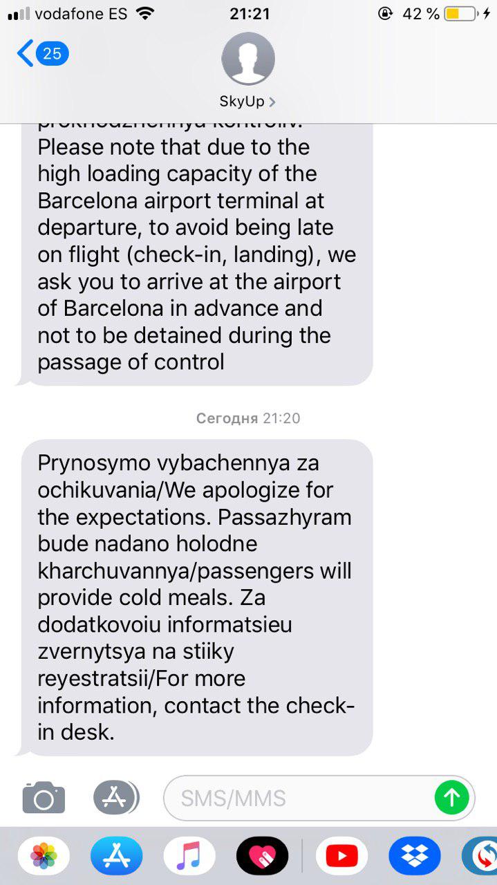 Через два часа с небольшим, пассажиру рейса пришло смс-сообщение с уведомлением о предоставлении от авиакомпании холодной закуски. В этом же сообщении ему рекомендовали обратиться "за дополнительной информацией (очевидно, о получении - пищи - прим.ред.) на стойку регистрации", однако фактически это не осуществимо, т.к. люди уже прошли предвзлетный контроль и не могут вернуться обратно в его начало.