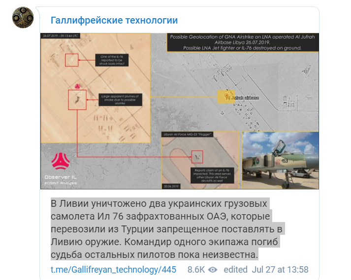 А в Telegram-канал "Галлифрейские технологии" сообщает, что украинские грузовые воздушные суда были зафрахтованы ОАЭ и перевозили в Ливию из Турции запрещенное оружие. Также в опубликованной на канале новости сказано, что командир одного экипажа погиб, а судьба остальных пилотов пока неизвестна.