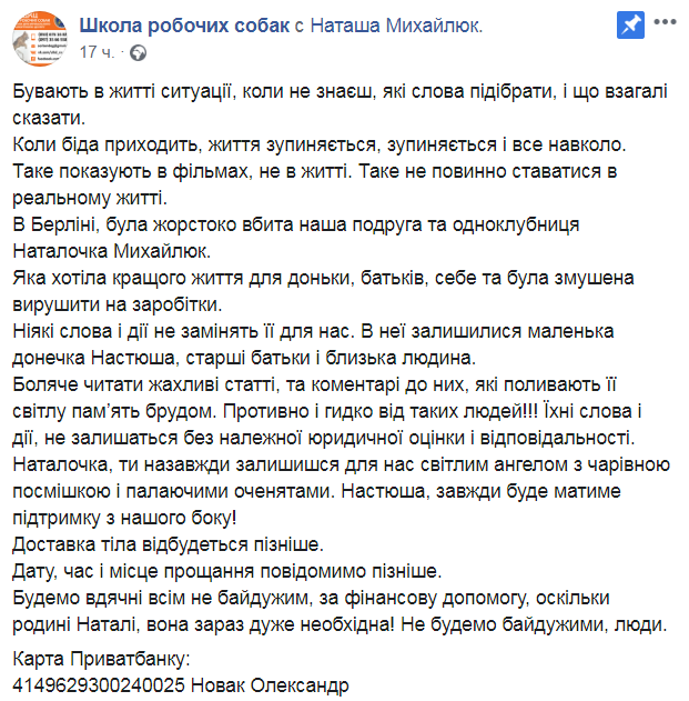 В интернете объявили сбор средств для 25-летней Натальи Михайлюк из города Заставна, что в Черновицкой области, которую убили в Берлине 25 июля. Объявление о сборе средств разместил на Facebook клуб "Школа рабочих собак", в котором состояла молодая женщина.