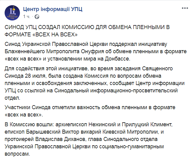 Вчера, 28 июля, Синод Украинской Православной Церкви поддержал инициативу блаженнейшего митрополита Онуфрия об обмене пленными в формате "всех на всех" и создал для содействия обмену специальную комиссию. О решении синода сообщается на Facebook-странице Центра информации УПЦ.