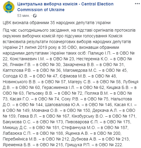 Кроме того, во время заседания ЦИК приняла протоколы ОИК ОВО № 65, № 66, № 91, № 93, № 98, № 193 с пометкой "Уточненный". В то же время Центризбирком поручил подготовить и предоставить протоколы об итогах голосования ОИК ОИО № 210 с пометкой "Уточненный" до 30 июля.